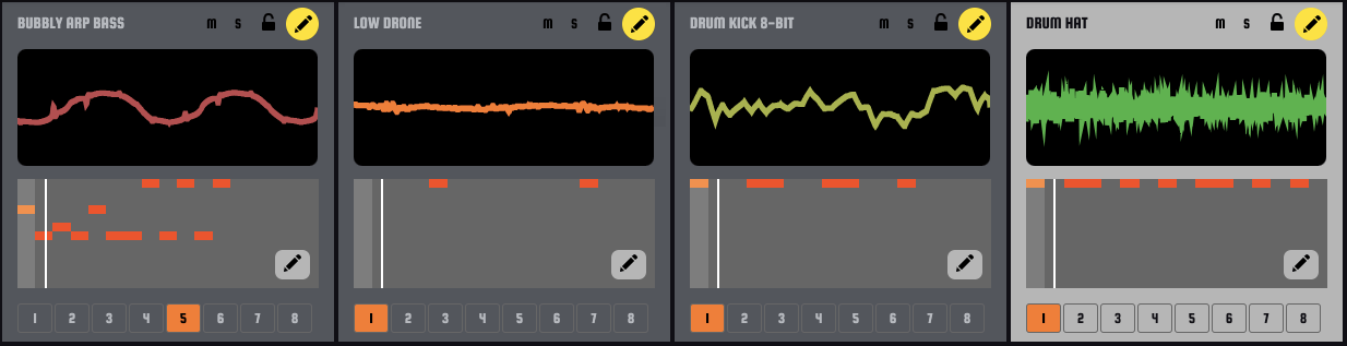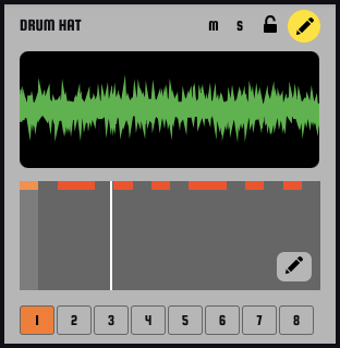 - Buttons to mute or solo the channel, along with a button to lock the channel, preventing any accidental pattern switches. The pencil button opens the instrument editor for the channel.