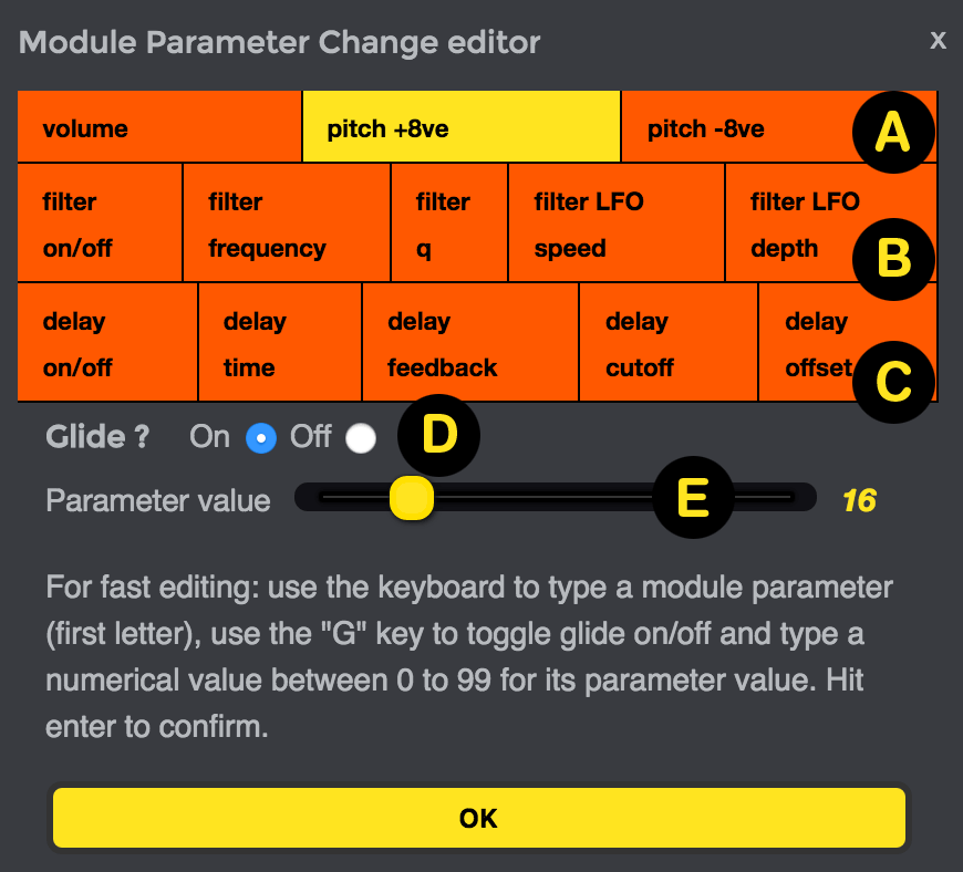 A module parameter is a fancy word that describes one of the properties of an effects module, for instance the frequency of the filter module. Apart from adjusting the properties of the instruments effects modules, you can also target note specific articulations such as volume and pitch glide.