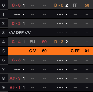 In row 5 there is no note being triggered, but a parameter modulation. In this case the volume will be set to a value of 50. The "G" indicates that the volume will glide to its new value (a gradual process that lasts a single pattern step in length). The modulation instruction in row 4 uses no glide, and thus acts instantaneously.