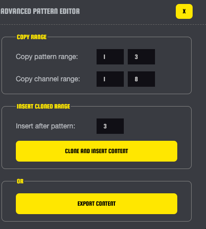 By clicking Clone and inserted content, the select pattern and instrument range are injected into the current song. By clicking Export content, the selected pattern and instrument range are exported into an .XPT file.