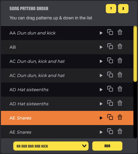 This list contains a a series of patterns which define their playback order within the song. The same pattern can appear multiple times within this list, allowing you to reuse the same pattern without having to manage duplicates.