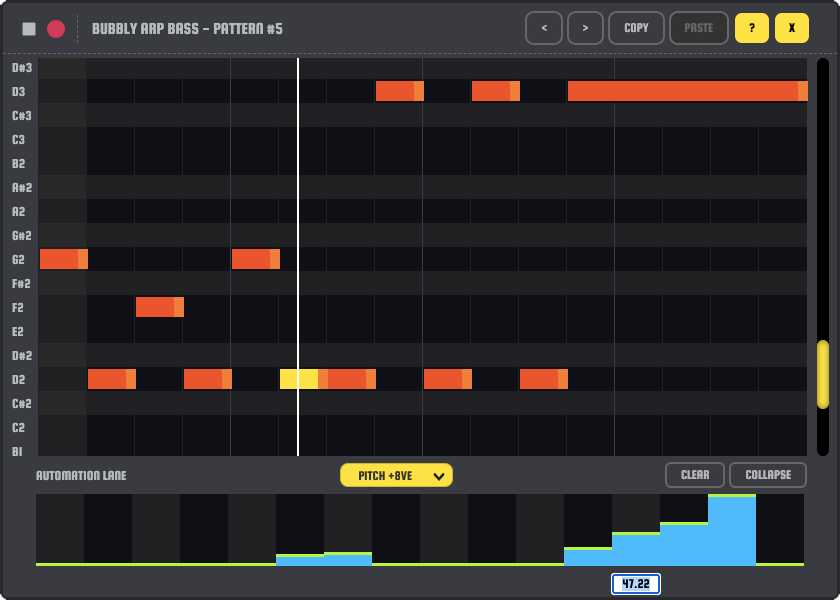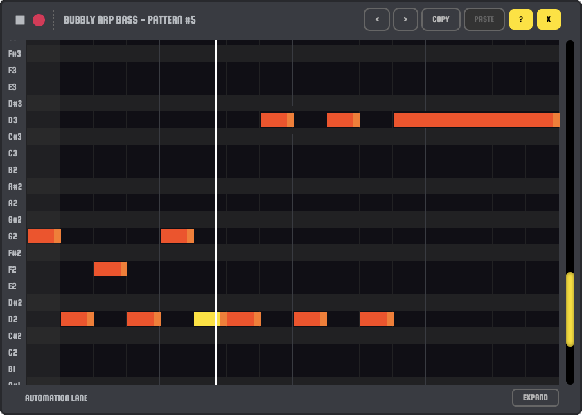 The automation lane is unique to the pattern currently being edited and can contain parameter value adjustments for either the instruments modules or its volume, pan and pitch.